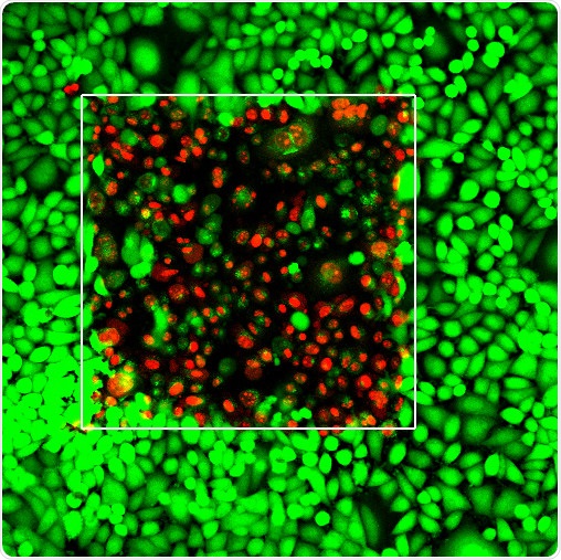 The laser irradiated area (white square) shows live cancer cells (green) as well as dead cancer cells (red) as a result of the irradiation. Credit:University at Buffalo