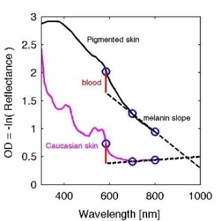 Steven L. Jacques, Oregon Health & Science University, Portland, OR/USA now presents a practical approach for assessing the melanin and blood content of the skin from total diffuse reflectance spectra. It is based on the 1985 work of Kollias and Baquer who proposed using the slope of the optical density (OD) versus wavelength, OD(λ) = –log (R(λ)), between 620 nm and 720 nm as a metric for the epidermal melanin content. Jacques’ method offers a quick spectral analysis using just three wavelengths, namely 585 nm, 700 nm, and 800 nm.