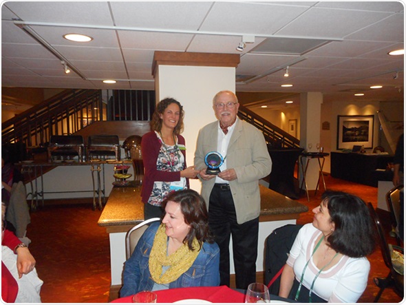 Laura Walker, Ph.D., executive director of the Envision Research Institute, presents a Lifetime Achievement Award in Low Vision Research to Manfred MacKeben, Ph.D., during the May 6 annual meeting of the Low Vision Research Group, held in conjunction with the ARVO meeting in Denver. Dr. MacKeben is a scientist at The Smith-Kettlewell Eye Research Institute in San Francisco.
