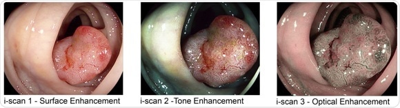 Contrast enhancement using i-scan OE highlights the epithelial mucosal surface pattern and especially the vascular pattern in detail. i-scan OE facilitates detection and in vivo diagnosis of lower gastrointestinal tract pathology enabling targeted endotherapy.