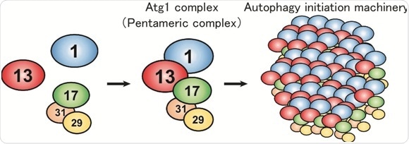 In budding yeast, the Atg1 complex, comprising Atg1, Atg13, Atg17, Atg29 and Atg31, mediates the initiation of autophagy (Figure 1). When autophagy is induced by starvation, these five components gather to form a dimer of pentamers. However, the formation of the dimer of pentamers alone is not sufficient for autophagy induction: and dozens of the pentameric complexes need to assemble into a supramolecular complex of autophagy initiation machinery elements. However, the molecular mechanism has been elusive.