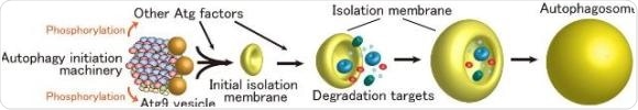 The autophagy initiation machinery mediates formation of the initial isolation membrane through the recruitment of Atg9 vesicles. At the same time, the machinery phosphorylates Atg factors including Atg9, thereby promoting autophagosome formation.