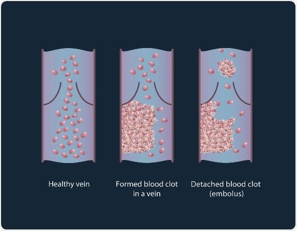 Healthy vein, thrombus formation and its detaching from a vessel wall, leading to thromboembolism.