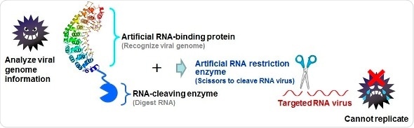 Analyse virus gene information and create an artificial RNA restriction enzyme. Viruses cannot replicate as their gene information is cleaved (which means virus cannot cause diseases). This technique can be applied to all kinds of RNA viruses both for animals and plants.