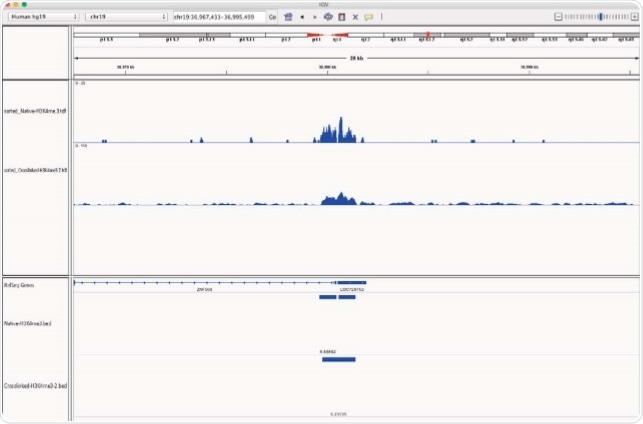 Data is presented which demonstrates strong and comparable enrichment of H3K4me3 from both Native and Cross-linked chromatin. The study highlights that both Native and Cross-linked chromatin preparation methods are compatible with Chromatrap® extraction and capture technology. Providing excellent data both these methods ensure superior H3K4me3 enrichment followed by high throughput sequencing. In addition, the study shows high quality FASTQC metrics and significant genome wide peak enrichment levels are obtainable using both assay technologies.