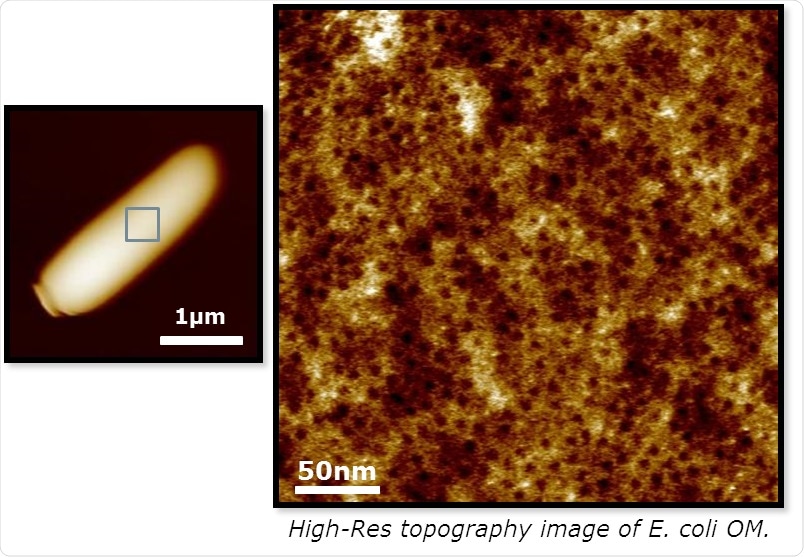 Top: high lateral resolution on living bacteria in saline buffer solution. Bottom: time lapse resolved action of peptide disrupting bacteria membrane