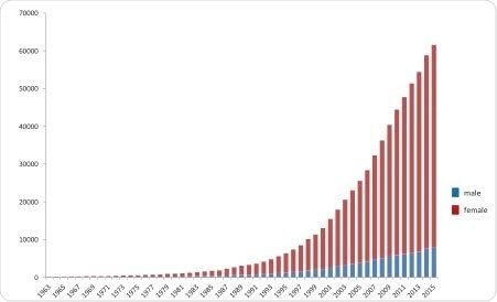 Centenarians in Japan between 1963 and 2015.
