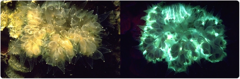 Coral photographed with white light (left) and fluorescing under ultraviolet light (right)