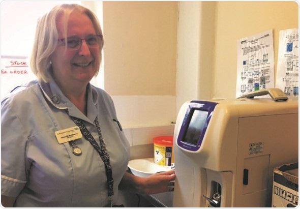 Shelagh Wojtowicz, Staff Nurse, with the newly installed HORIBA Medical Microsemi CRP analyser at the Marlow Community Hub