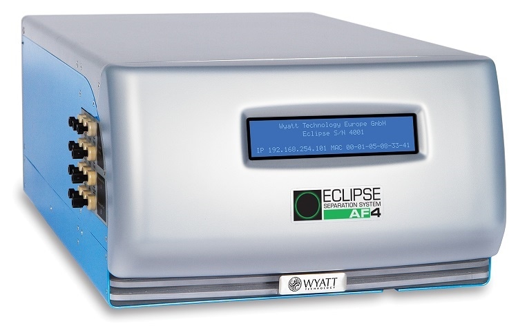 The Wyatt instruments we have include 1) the short AF4 channel, the central piece within which the nanoparticles are separated; 2) The ECLIPSE AF4, which controls the flow of AF4; 3) The Dawn Heleos II equipped with QELS at 100° position, which are online multi-angle light scattering (MALS) and dynamic light scattering (DLS) monitors, respectively.