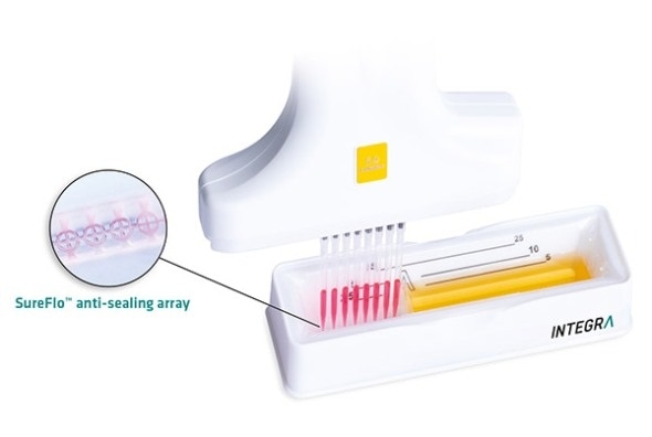 Each reservoir benefits from the company’s SureFlo™ anti-sealing array, which prevents tips from sealing off and liquid ‘popping’ into tips, filters or pipettes. This feature is enhanced with a specially formulated inert, hydrophilic surface treatment that stops liquid from pooling and results in the lowest dead volume on the market. The new design perfectly complements INTEGRA’s entire family of multichannel EVOLVE manual pipettes, VIAFLO electronic pipettes and VOYAGER adjustable spacing pipettes. The eight-channel VOYAGER pipette is ideal for aspirating from the 5 ml side and then dispensing into a 96- or 384-well plate, providing significant benefits when working with expensive reagents, such as PCR master mix.