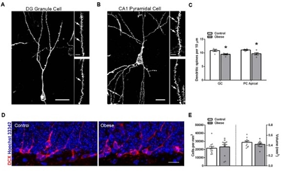 Elise Cope and colleagues replicated previous research by demonstrating diet-induced obesity in mice impairs performance on cognitive tasks dependent on the hippocampus and results in loss of dendritic spines — the neuronal protrusions that receive signals from other cells — and activates microglia.