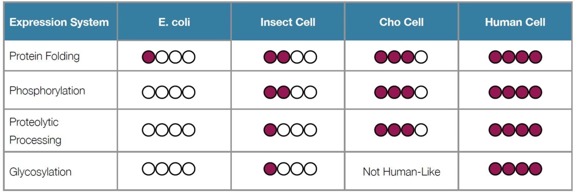 Comparison of proteins produced using different expression systems. Colored circles denote level of similarity to human proteins. (Credit: Proteintech)