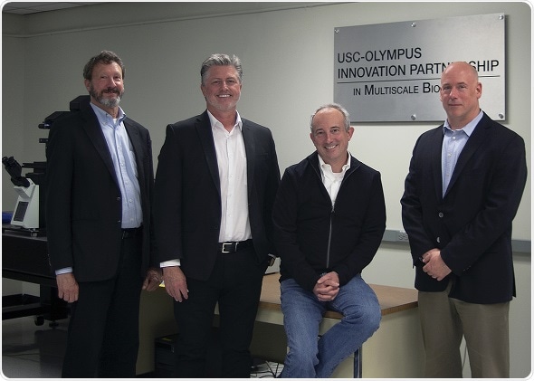 Pictured from left to right: Dr. Scott Fraser, Director, USC Translational Imaging Center; Lee Wagstaff, VP, Olympus Corporation of the Americas Scientific Solutions Group; Dr. David Agus, Founding Director, Lawrence J. Ellison Institute for Transformative Medicine of USC; and David Rideout, ED of Marketing, Olympus Corporation of the Americas Scientific Solutions Group.