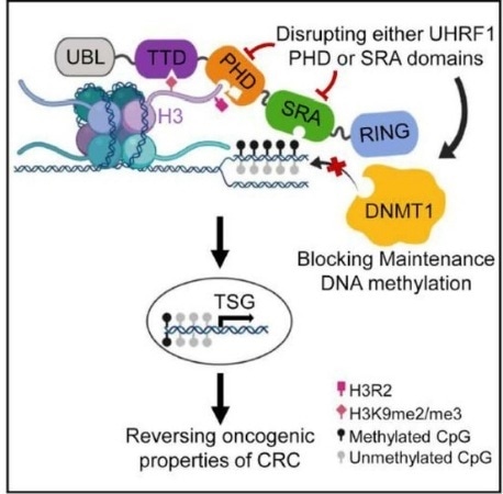To better understand how UHRF1 operates, the researchers devised an experiment that allowed them to block discrete parts of this protein in human colon cancer cells with established abnormal methylation patterns. Their results showed that two distinct segments of the protein were pivotal in helping cells maintain these abnormal patterns: one called plant homeodomain (PHD) and another called SET and RING-associated domain (SRA).