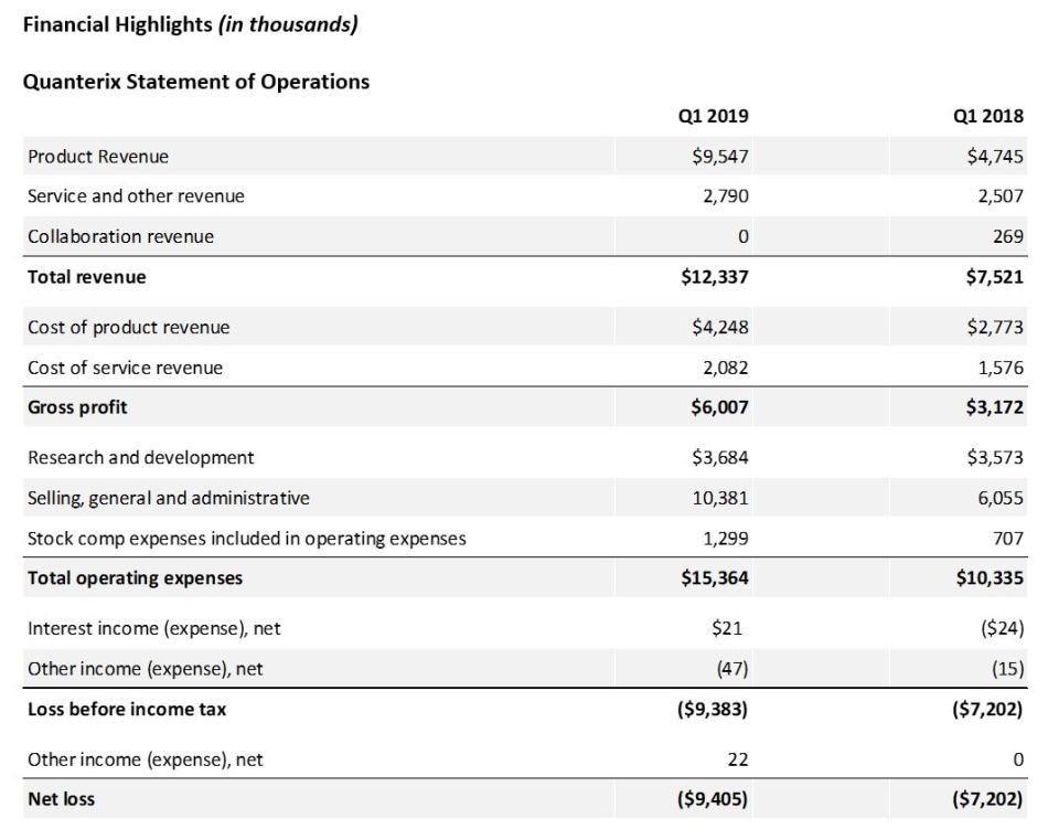 Quanterix Corporation, a company digitizing biomarker analysis to advance the science of precision health, today announced financial results for the three months ended March 31, 2019.