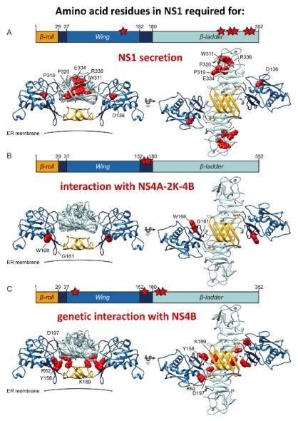 Overview of amino acid residues in NS1 required for NS1 secretion, interaction with the NS4A-2K-4B precursor and RNA replication. Credit: Płaszczyca A, et al. (2019)
