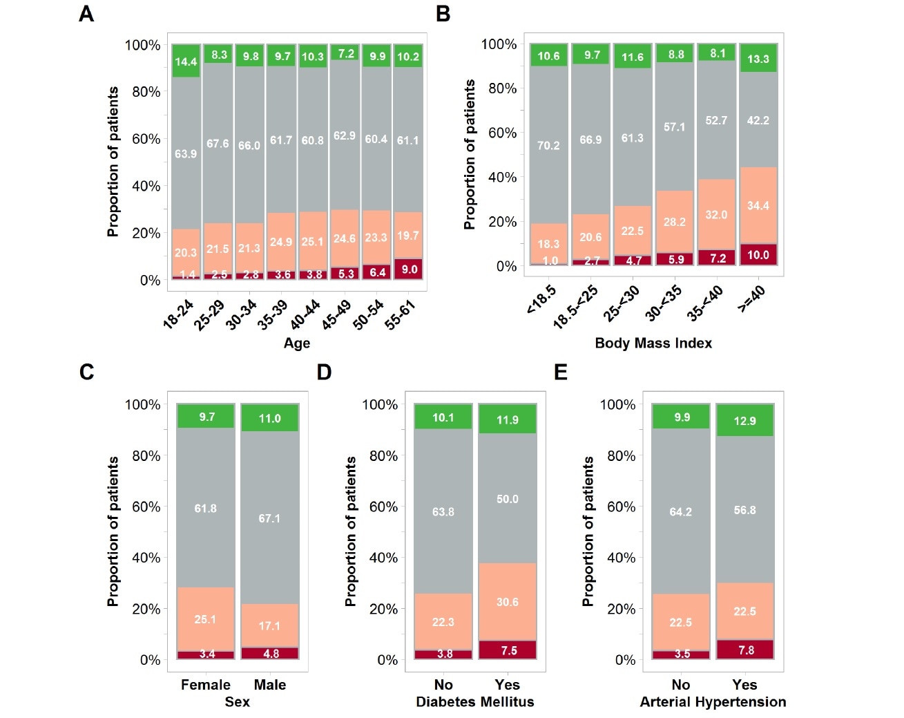 The severity of self-reported COVID-19 courses is shown for all individuals who reported a positive test for SARS-CoV-2 from an oro- or nasopharyngeal swab between January and July. Results are shown by age group (Panel A), body mass index (Panel B), sex (Panel C), diabetes medication (Panel D), and arterial hypertension medication (Panel E). Red color indicates respiratory hospitalizations, defined by in-patient care with supplemental oxygen or mechanical ventilation or hospitalization for dyspnea or cough. Rose color indicates severe respiratory tract infections defined by the combination of at least fever and cough, dyspnea and cough, dyspnea and fever, or dyspnea and myalgia, but no need for hospitalization. Gray color represents mild/moderate courses. These participants did not meet the criteria for severe respiratory tract infections but reported symptoms such as fever, myalgia, sore throat, loss of taste/smell, cough, or dyspnea.