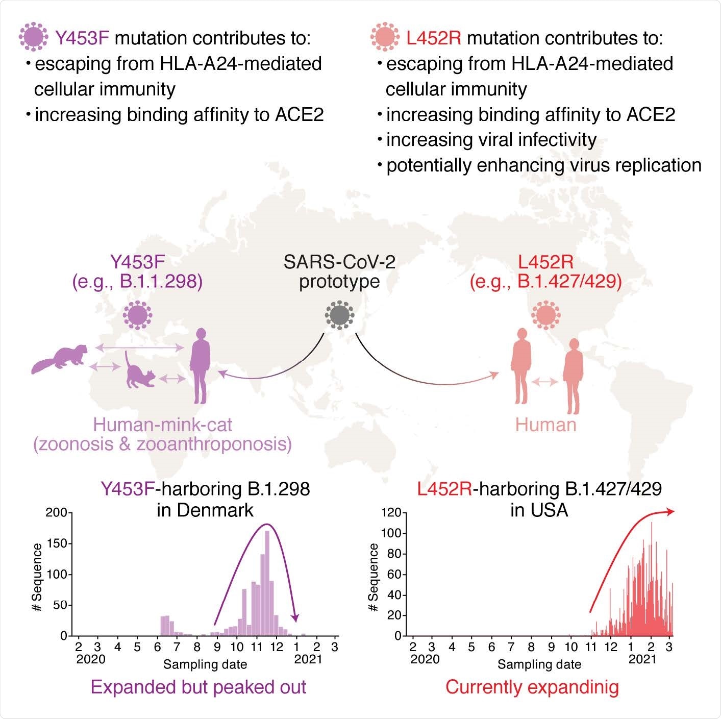 Altogether, the researchers found the L452R mutation and Y453F mutation in B.1.298 on the receptor-binding domain of SARS-CoV-2 can escape HLA-24-restricted cellular immunity. The mutations also reinforced the affinity to ACE2. The L452R mutation also increased protein stability, viral infection into human host cells and promoted viral replication in the body.