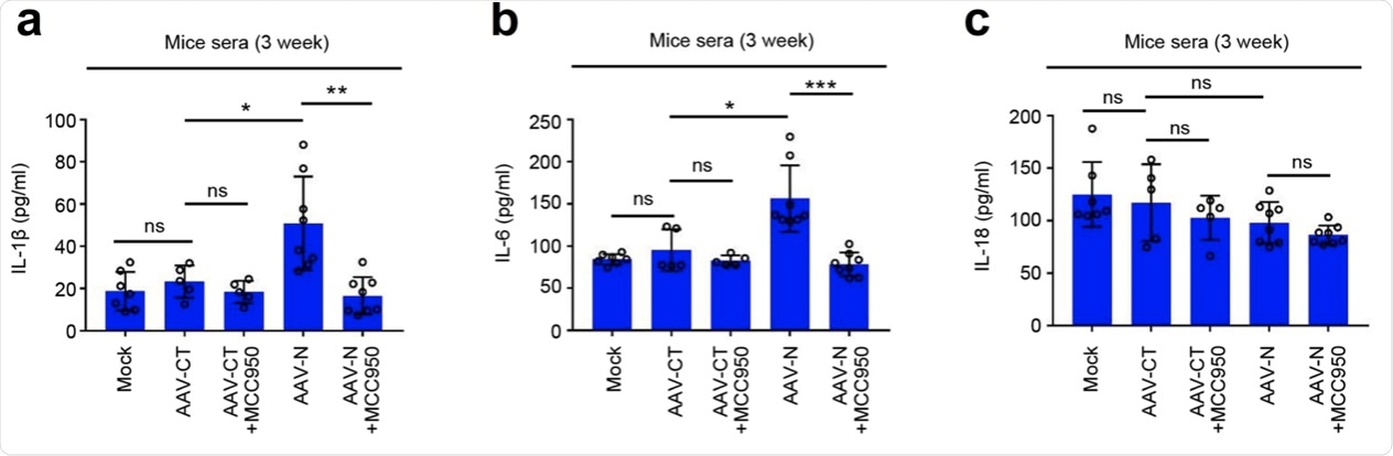 Additionally, this study showed that the levels of IL-1β and IL-6 in the lungs and sera were increased by the lung-specific expression of N protein. However, the expressions of IL-1β and IL-6 were significantly reduced following the administration of MCC950 and Ac-YVAD-cmk to the infected mice.