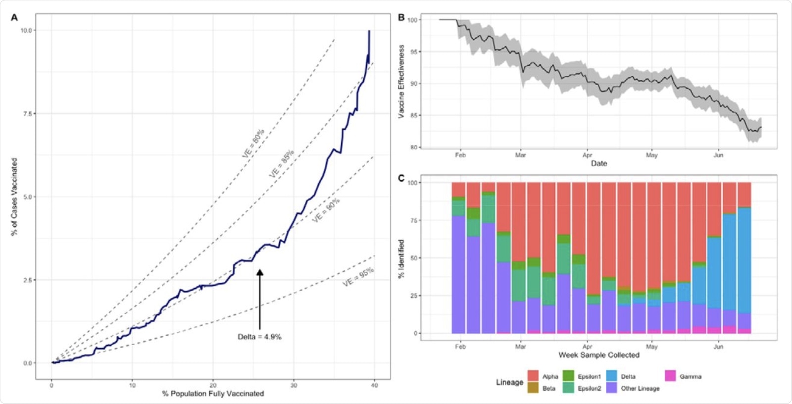 It was also observed that the number of SARS-CoV-2 cases increased by end of June to 10.5%, which was more than the expected value of 6.4%. This rise in cases was accompanied by a reduction in VE from 90% in mid-May to 83% by the end of June.