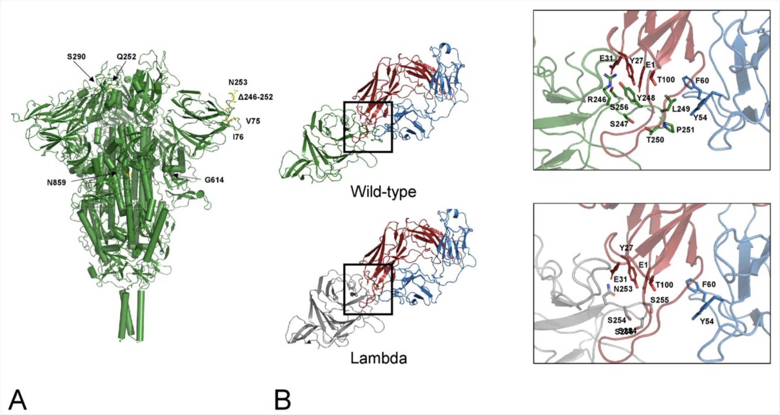 The results showed that two of the lambda mutations, G75V and T76I, were located at an exposed loop between two antiparallel β-strands. Both of these mutations were found to stabilize the spike glycoprotein. Additionally, these two mutations appear to ensure that the loop remains in contact with another loop between positions 246-280, which is a binding site for monoclonal antibodies (MAbs) specific to the virus.