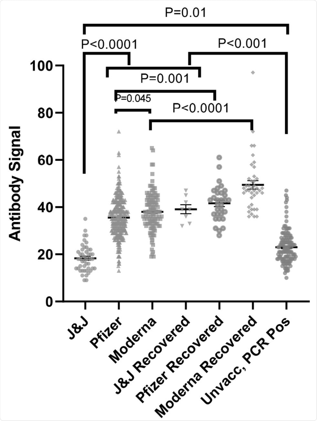 Individuals who had received the J&J vaccine exhibited lower antibody levels as compared to the other two vaccines, both in naïve and recovered individuals. Thus, it can be concluded that the efficacy of the J&J vaccine was lower than Pfizer and Moderna vaccines.