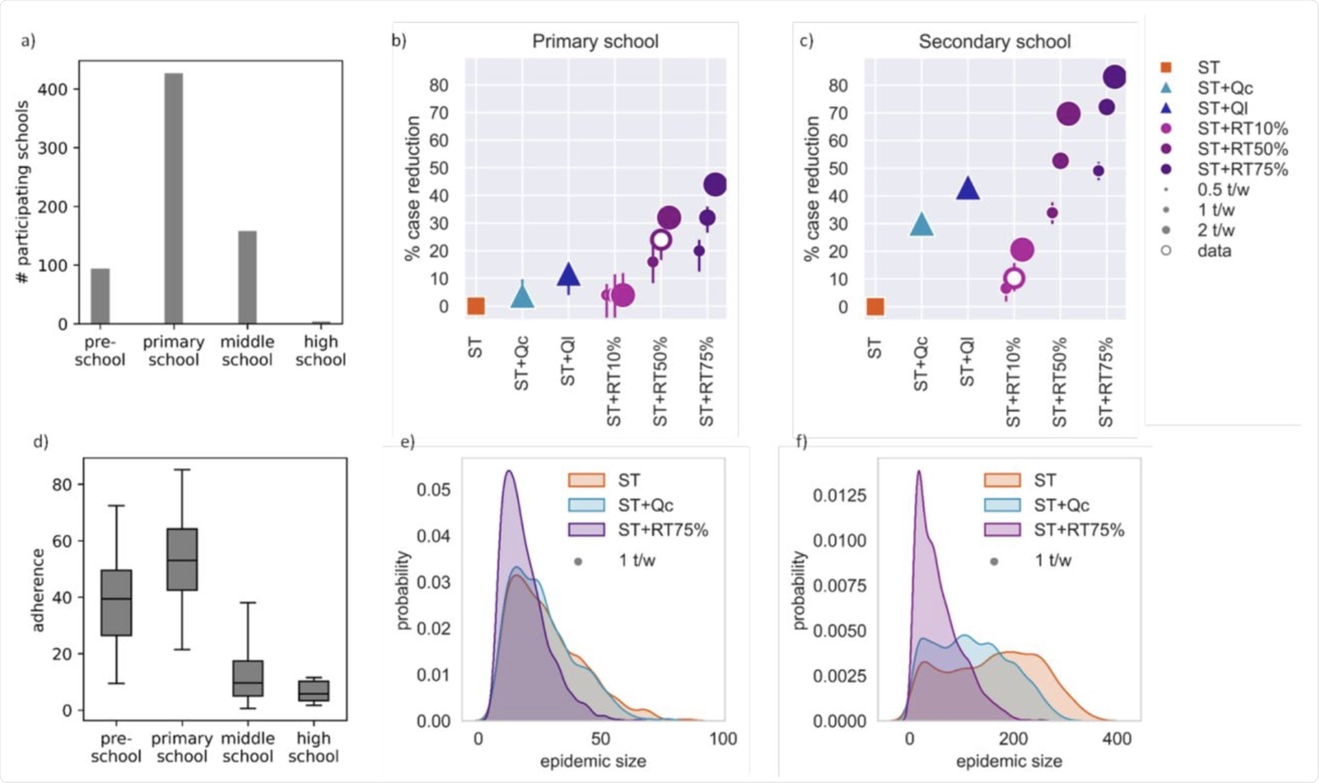 (a) Number of schools participating in the screening initiative during the third wave in France, according to school level (pre-school, primary school, middle school, and high school). (b) Predicted percentage of reduction in the number of cases achieved by each intervention protocol with respect to the basic strategy of the symptom-based testing (ST) in the primary school. Intervention protocols are: symptom-based testing and case isolation, with reactive quarantine of the class (ST+Qc); symptom-based testing and case isolation, with reactive quarantine of the class level (ST+Ql); symptom-based testing and case isolation, coupled with regular testing with a percentage of adherence (ST+RTα%), with α=10%, 50%, and 75%. For regular testing, different frequencies are shown: one test every two weeks, a weekly test, two tests per week. Error bars correspond to 95% confidence intervals. The empty marker corresponds to the adherence estimated from empirical data recorded in schools of that level (from panel d). (c) As in panel b, for the secondary school. (d) Estimated adherence to screening recorded in the different school levels participating to the screening initiative in the third wave in France. Error bars correspond to 95% confidence intervals. (e) Probability distribution of the simulated final epidemic size in the primary school for selected protocols at the end of the trimester. Regular testing is done with weekly frequency. (f) As in panel e, for the secondary school.