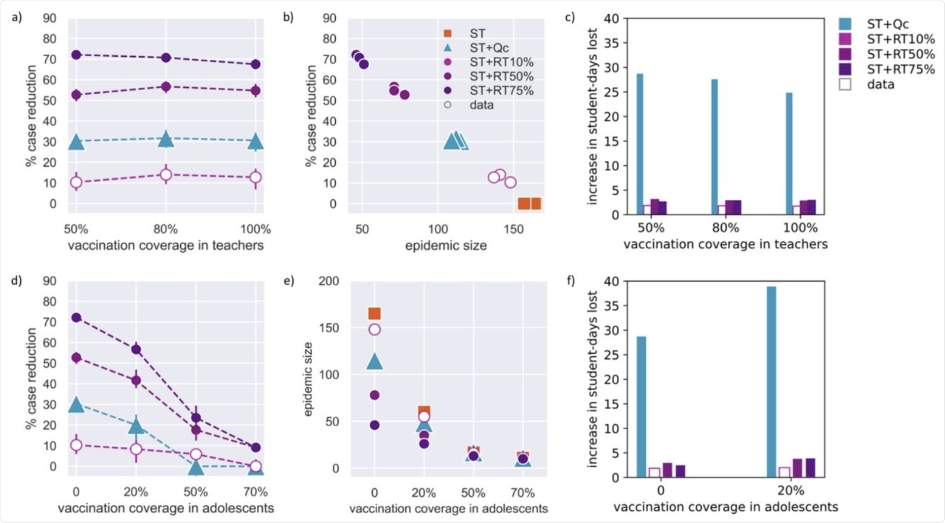 (a) Predicted percentage of reduction in the number of cases achieved by selected protocols as a function of the vaccination coverage in teachers in the secondary school. The case reduction is computed relative to the basic strategy (symptom-based testing, ST). (b) Predicted percentage of reduction in the number of cases achieved by intervention protocols as a function of the median epidemic size in the secondary school. The case reduction is computed relative to the basic strategy (symptom-based testing, ST). Dots of the same protocol for different vaccination coverage are clustered together. (c) Predicted increase in student-days lost for selected protocols as a function of the vaccination coverage in teachers in the secondary school. The increase in days lost is computed relative to the basic strategy (symptom-based testing, ST). (d) Predicted percentage of reduction in the number of cases achieved by selected protocols as a function of the vaccination coverage in adolescents in the secondary school. The case reduction is computed relative to the basic strategy (symptom-based testing, ST). (e) Predicted total epidemic size at the end of the trimester vs. the vaccination coverage in adolescents in the secondary school in selected protocols. (f) Predicted increase in student-days lost for selected protocols as a function of the vaccination coverage in adolescents in the secondary school. The increase in days lost is computed relative to the basic strategy (symptom-based testing, ST). The 50% and 70% data points are not shown as the median student-days lost for ST is equal to zero (the likelihood of generating a clinical infection among the pupils - recognizable on the basis of the symptoms - becomes low with increasing vaccination coverage). In all panels, the empty markers and bars correspond to the adherence estimated from empirical data recorded in schools of that level.