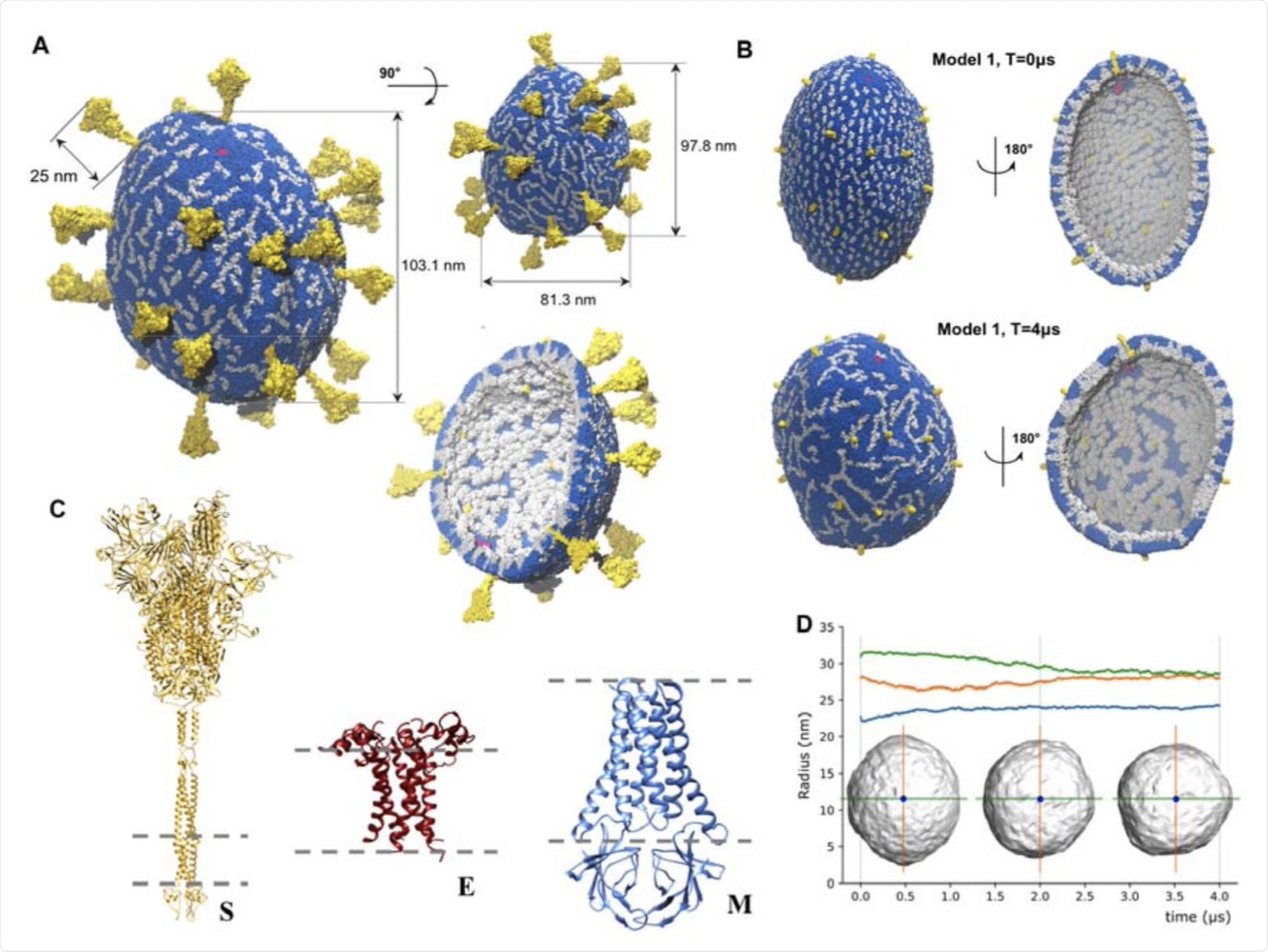 The viral envelope is flexible and lacks symmetry. The structures of E, M and S proteins have not been resolved experimentally. There are some structural insights available on S trimers and E pentamers, but there is no accurate model of the M dimer.