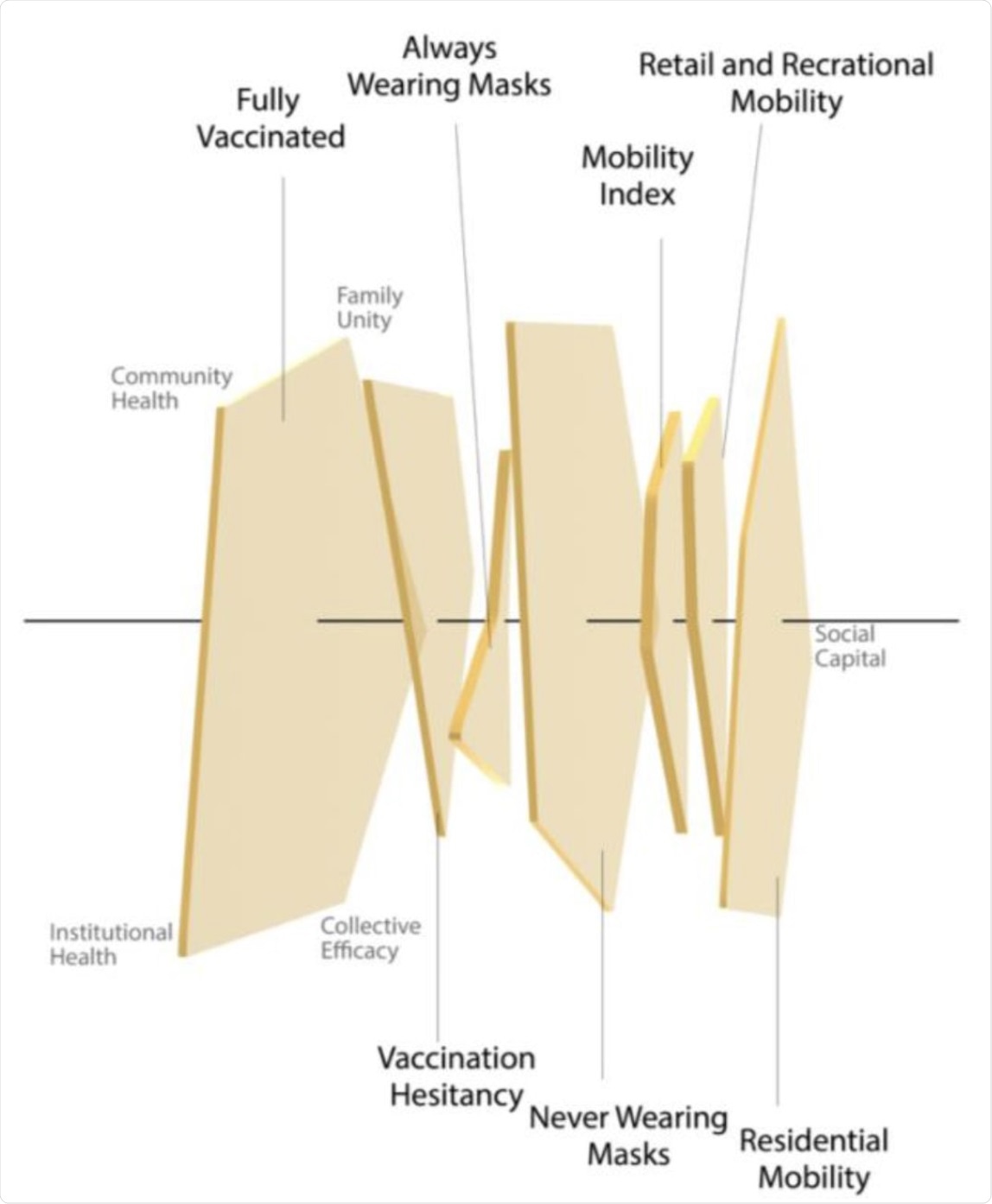 This study estimated the effects of social capital on public health behaviors related to the COVID-19 pandemic using a list of variables in the analysis with descriptive statistics. The variables included social capital, family unity, community health, institutional health, collective efficacy, full vaccination or hesitancy (as of June 2021), wearing masks or never (June 2020), mobility index (Week of 23 March 2020), retail and recreation, and residential. The researchers assessed the bivariate relationships between each social capital index and public health behavior using standardized linear regression.