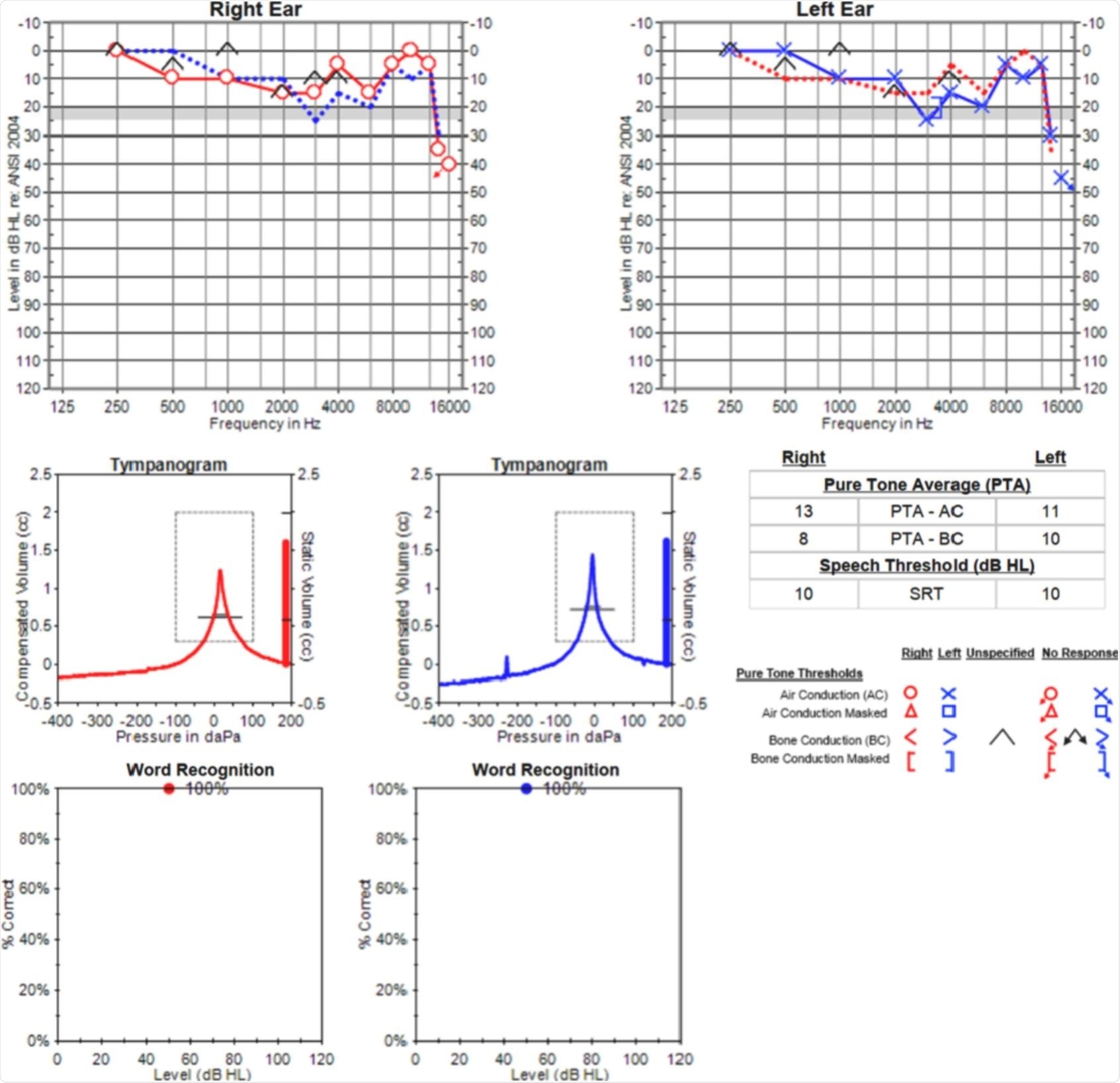 Audiometric testing revealed normal hearing thresholds through 8000 Hz, with mild bilateral hearing loss above 12.5 kHz. Tympanometry was normal, and word recognition scores were excellent bilaterally.