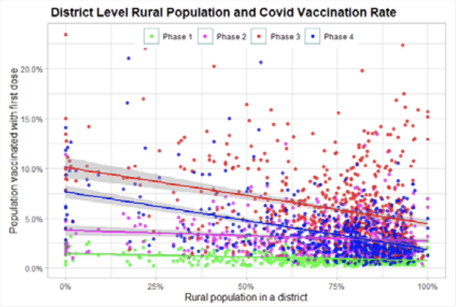 The rural-urban divide is not new but is most pronounced during the third and fourth phases. The urban areas experienced COVID-19 earlier, as well as being more aware of the disease and the vaccines. The rural areas, in contrast, were primarily hit during the second wave, which coincides with the third and fourth phases of vaccine rollout in India.