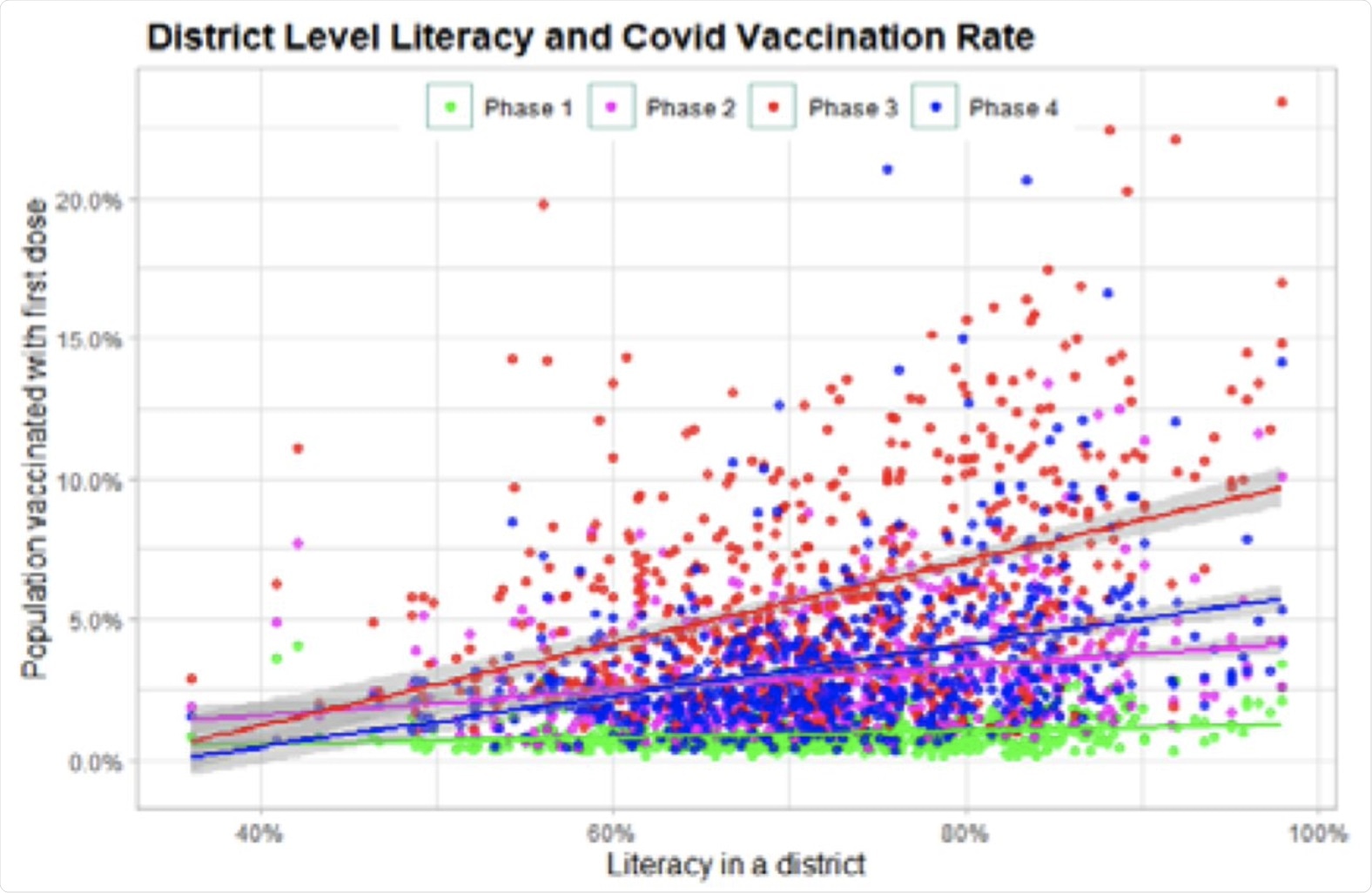 Linguistic barriers may have driven the relationship between illiteracy rates and vaccine hesitancy, as vaccine slots were booked online using an English-language app.