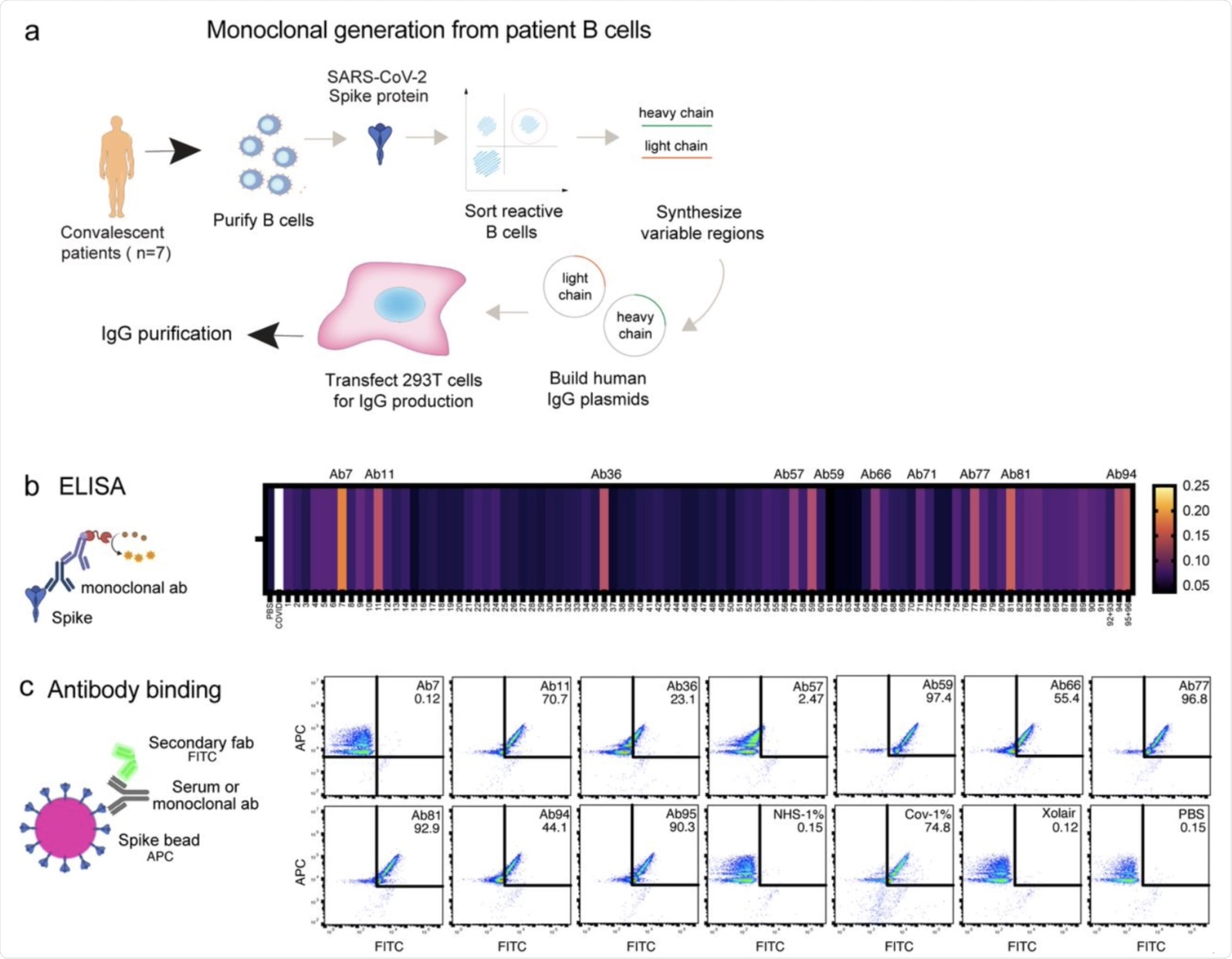 Blood samples were also collected from 20 patients with mild, moderate, or severe COVID-19. These blood samples were used for the isolation of B-cells. Spike proteins were incubated with the B-cells followed by bulk cell sorting, genome sequencing, and antibody reactivity screening.