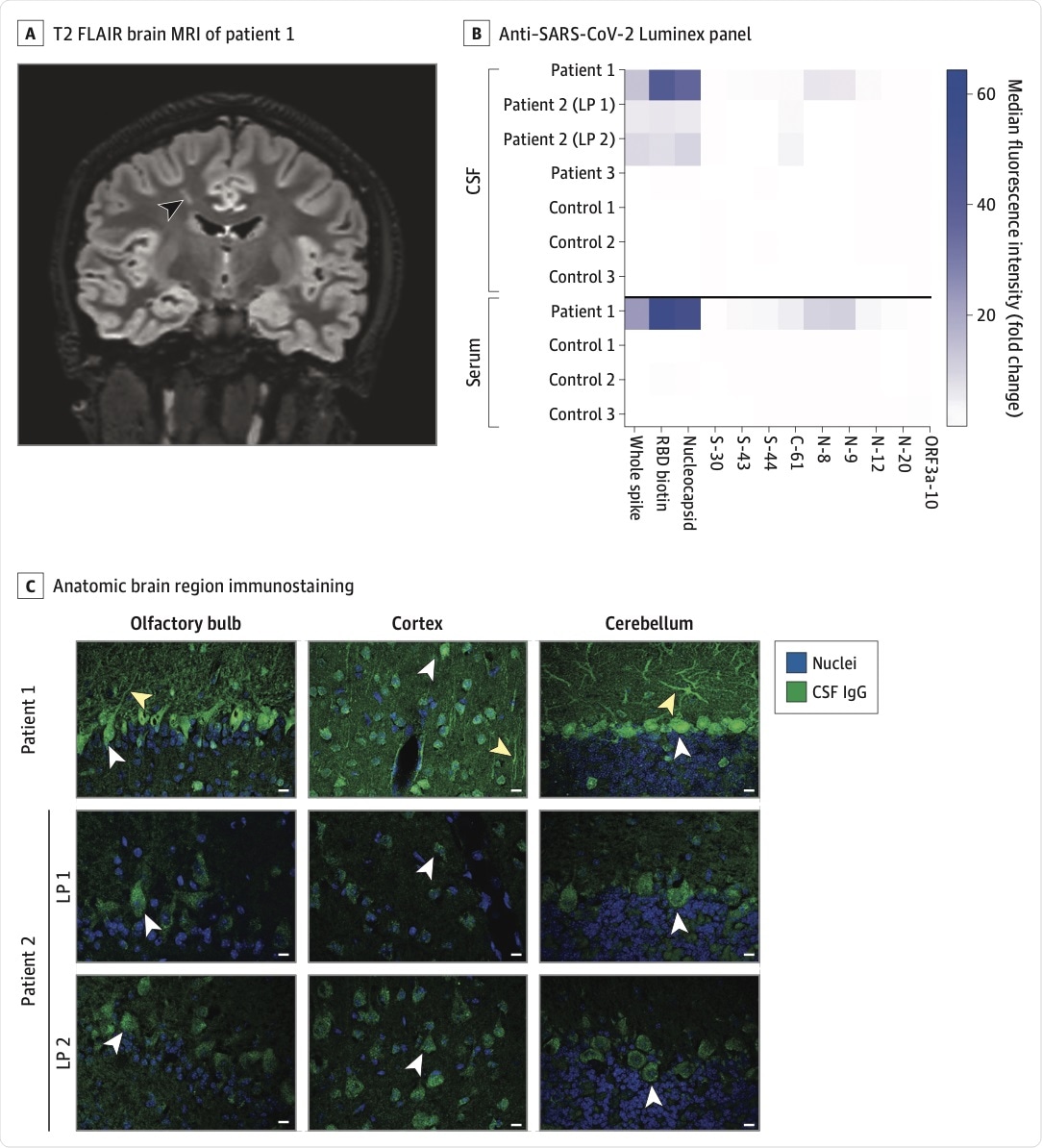 There were few or no signs of CSF inflammation; however, CSF testing showed the presence of antibodies to SARS-CoV-2 and neural antigens. One of the three patients showed autoantibodies to other neural antigens, such as KIF21A, which is involved in abnormal brain development as well as congenital fibrosis of the muscles of the eye.
