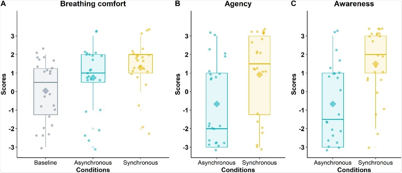 The mean rating of breathing comfort was 0.1 at baseline, -0.8±1.8 for asynchronous, and 1.3±1.4 for synchronous feedback, where -3 indicates least breathing comfort and 3 indicates highest breathing comfort. Of all patients, 91.2% were satisfied with the intervention and 66.7% perceived it as beneficial for their breathing. No patient reported any adverse event.