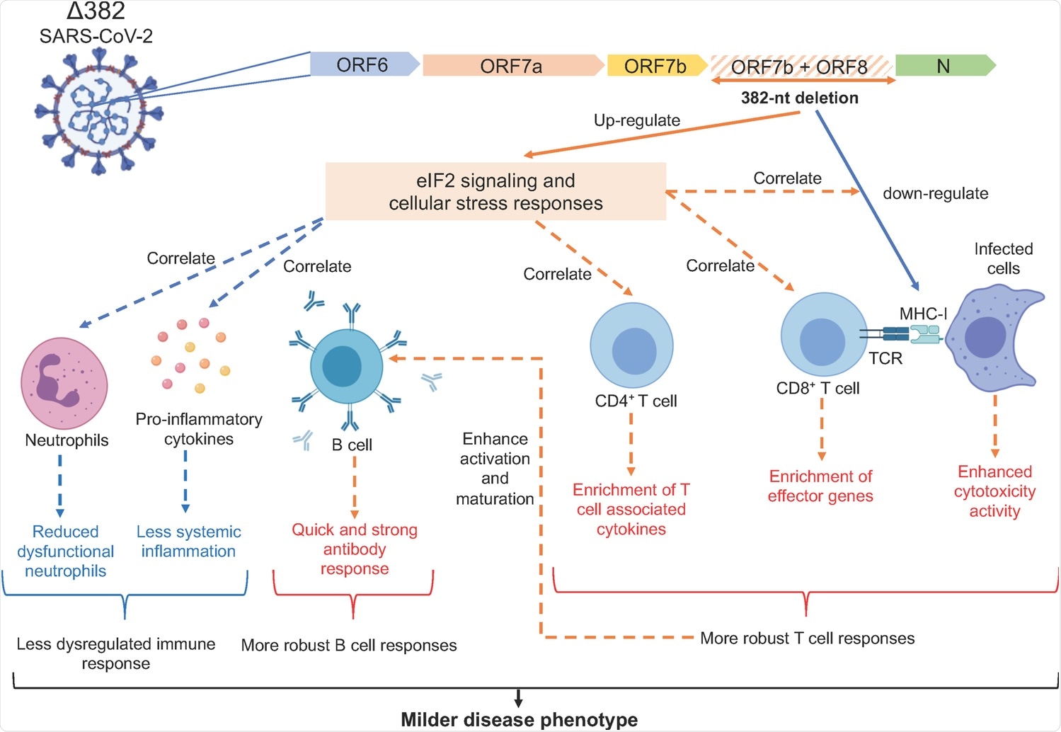 Molecular mechanisms underlying the milder disease phenotype in Δ382 SARS-CoV-2 infections. A SARS-CoV-2 variant with a 382-nucleotide deletion (Δ382) truncates ORF7b and removes the ORF8 transcription-regulatory sequence, eliminating ORF8 transcription. The ORF8 382-nt deletion has recently been associated with a milder disease phenotype. The attenuation of SARS-CoV-2 ORF8 upregulates eIF2 signaling and cellular stress responses at the acute phase of infection, potentially interrupting the downregulation of MHC-I molecules by ORF8 and also enhances the activation of both CD4+ and CD8+ T cells, evidenced by enrichment of effector cytotoxic genes and upregulation of SARS-CoV-2 specific T cell responses in Δ382 SARS-CoV-2 infected patients. Enhanced T cell responses may in turn mediate rapid and effective antibody responses in Δ382 SARS-CoV-2 infection. More pronounced cellular stress responses may further reduce systemic inflammation and dysfunctional neutrophils in Δ382 SARS-CoV-2 infected patients. Overall, the attenuation of SARS-CoV-2 ORF8 produced a molecular phenotype characterized by more pronounced cellular stress responses and a less dysregulated immune phenotype with more robust T and B cell responses.