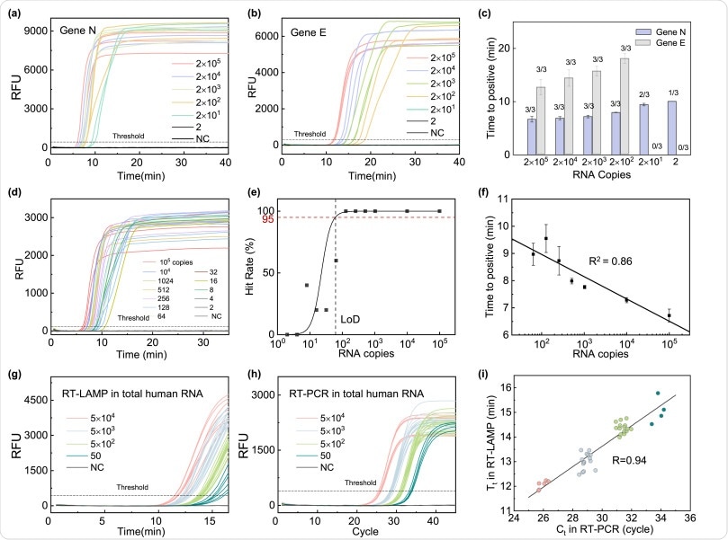 RT-LAMP assay validation. (a) N primer set results, and (b) E primer set results with viral RNA concentrations ranging from 2 and 105 copies per reaction. (c) Time to positive value comparison between the N primer set (blue bars) and the E primer set (grey bars) at different RNA concentrations. The N primer set showed better performances in terms of sensitivity and time to positive. (d) Real-time RT-LAMP result with a finer serial dilution (2 × ) using N primer set. (e) The extracted hit rate at various RNA concentrations to establish the assay LoD, which is determined to be 65 copies at 95% confidence level. (f) Time to positive value with N primer sets at concentrations ranging between 102 and 105 copies per reaction. A good linearity is obtained, indicating that a semi-quantitative test is feasible. (g) Real-time RT-LAMP result in saliva RNA background. (h) Real-time RT-PCR result in saliva RNA background. (i) The correlation between the RT-PCR and RT-LAMP measurement in total saliva RNA background. (For interpretation of the references to color in this figure legend, the reader is referred to the Web version of this article.)