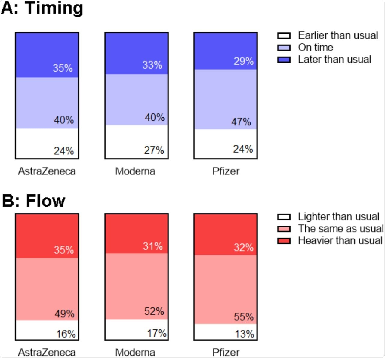 Association between reports of changes in timing (A) and flow (B) following first and second vaccine dose.