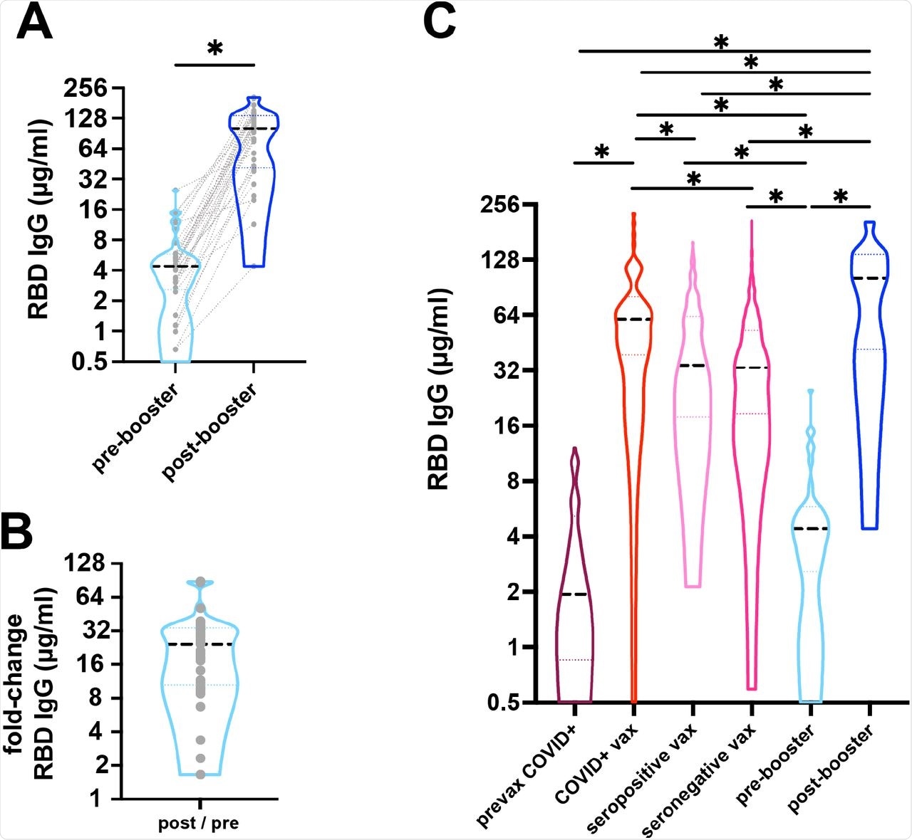 In a recent study published on the medRxiv* preprint server, researchers measured anti-receptor-binding domain (RBD) immunoglobulin G (IgG) and surrogate virus neutralization of the interaction between the SARS-CoV-2 spike protein and the human angiotensin-converting enzyme (ACE2) receptor, before and after vaccination with boosters in 33 healthy adults. The participants were asked to provide an e-consent form and complete online surveys about their COVID-19 history and vaccination status.