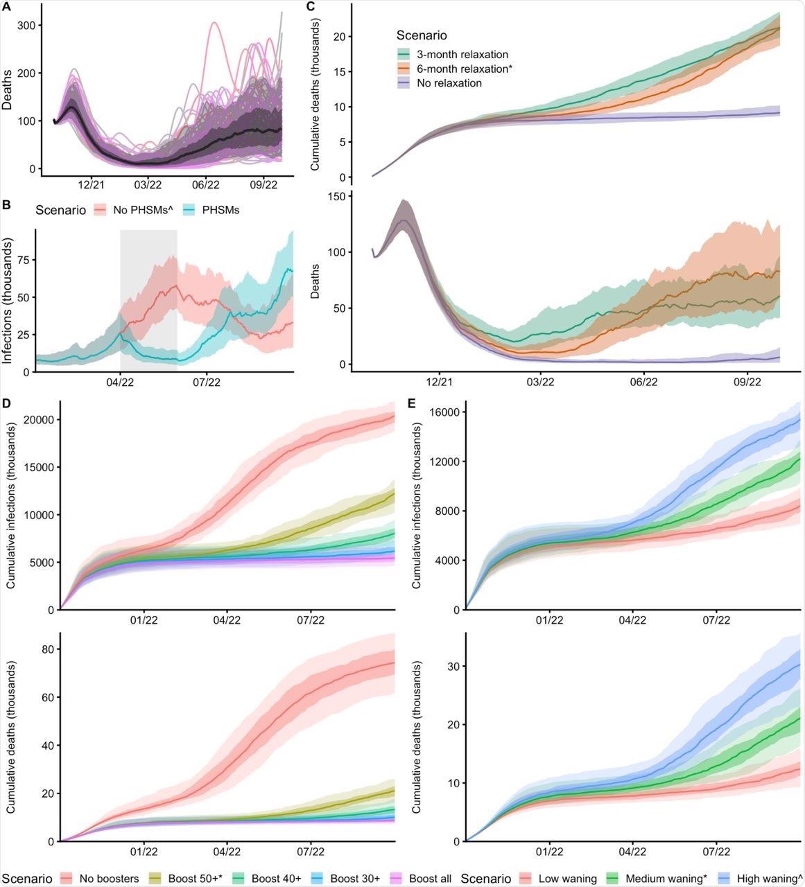The waning of vaccine protection is another key factor in the rate of transmission. Once again, the researchers considered three scenarios for the waning of vaccine protection, all assuming individuals with a vaccine booster did not wane, and 90% of all individuals over the age of 50 were boosted.