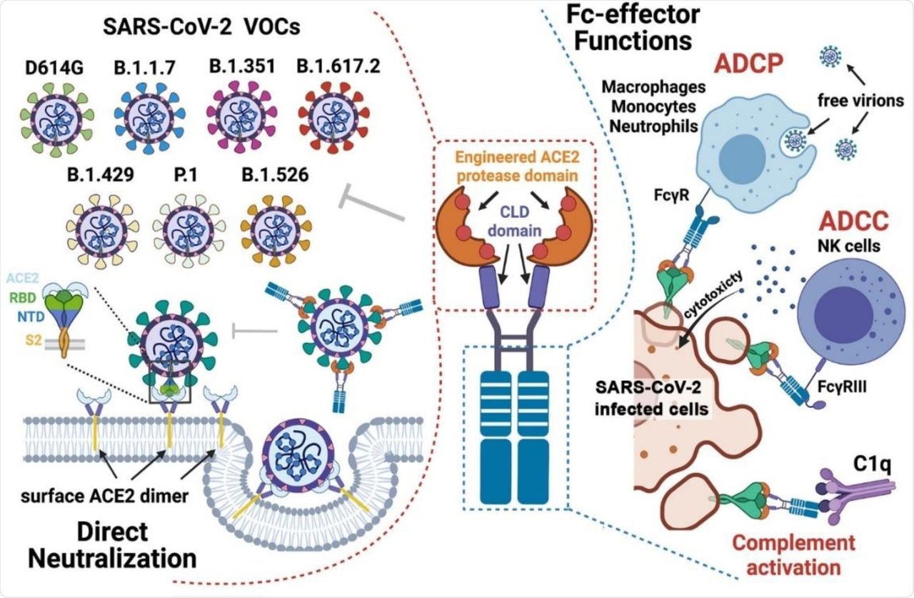 A new study published on the preprint server bioRxiv* employed a structure-guided approach for the development of a series of ACE2-Fc variants using human immunoglobulin 1 (IgG1) or IgG3 backbone. These variants were engineered to have a high affinity for the SARS-CoV-2 RBD, high affinity for Fcγ receptors that are involved in Fc-effector mechanisms, and mutations that helped to abrogate the angiotensin enzymatic activity of ACE2.