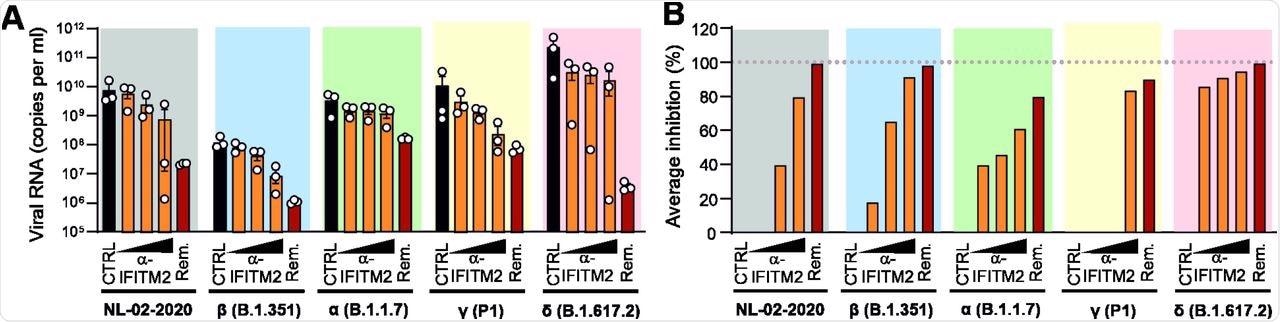 The researchers performed small interfering ribonucleic acid RNA (siRNA) knockdown (KD) studies in the human epithelial lung cancer cell line Calu-3, which endogenously expresses ACE2, and all three IFITM proteins to examine the role of endogenous IFITM expression on infection by SARS-CoV-2 VOCs. Viral replication was examined by quantitative reverse transcription-polymerase chain reaction (qRT-PCR), which estimated viral nucleocapsid (N) RNA levels in the cell culture supernatants two days after infection with SARS-CoV-2 variants.