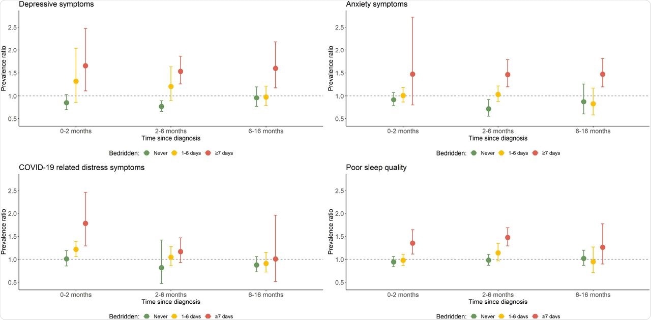 Those who had severe COVID-19 infection were bedridden for more than seven days as compared to those with mild disease. The extended bedridden time in COVID-19 patients was associated with an elevated risk of mental health symptoms, whereas COVID-19 patients who were never bedridden had a reduced risk of post-COVID mental health symptoms throughout the 16 months post-diagnosis. According to the authors, this association of extended bedridden time and adverse mental health symptoms was first identified in this study.