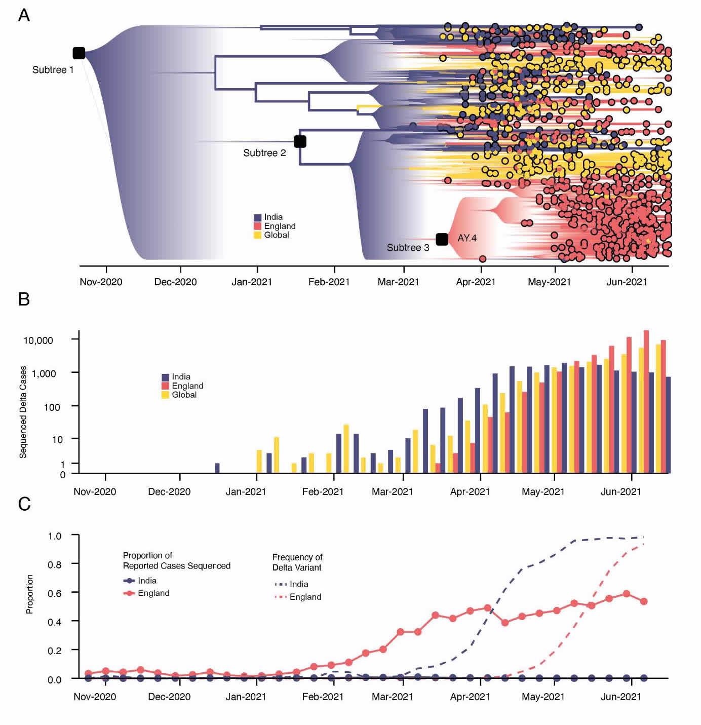 Emergence and rapid geographic expansion of Delta: a) time-calibrated phylogenetic reconstruction of Delta based on 1,000 sequences subsampled from 93,649 sequences from 100 countries (52,992 from England). The tree was split in 3 subtrees (n=28,783, 28,715, and 36,151 sequences) prior to full analysis. The roots of these 3 subtrees, and of lineage AY.4 are labeled. Lineage colors represent the inferred countries and/or regions where transmission occurred. b) Number of sequenced cases of Delta per week in India, England, and the rest of the world. c) Time-varying proportion of sequenced reported positive cases in India and England (solid lines, n = 52,992 sequences are from England, corresponding to 84% of all sequences from the UK) and the proportion of sequenced cases classified as Delta in India and England (dashed lines).