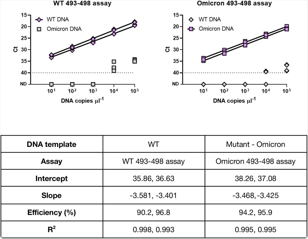 The current study assessed the specificity for wild-type (WT) and mutant targets at locus 493-498 by screening the synthetic DNA containing WT and Omicron sequences at these targeted loci by qPCR reactions.