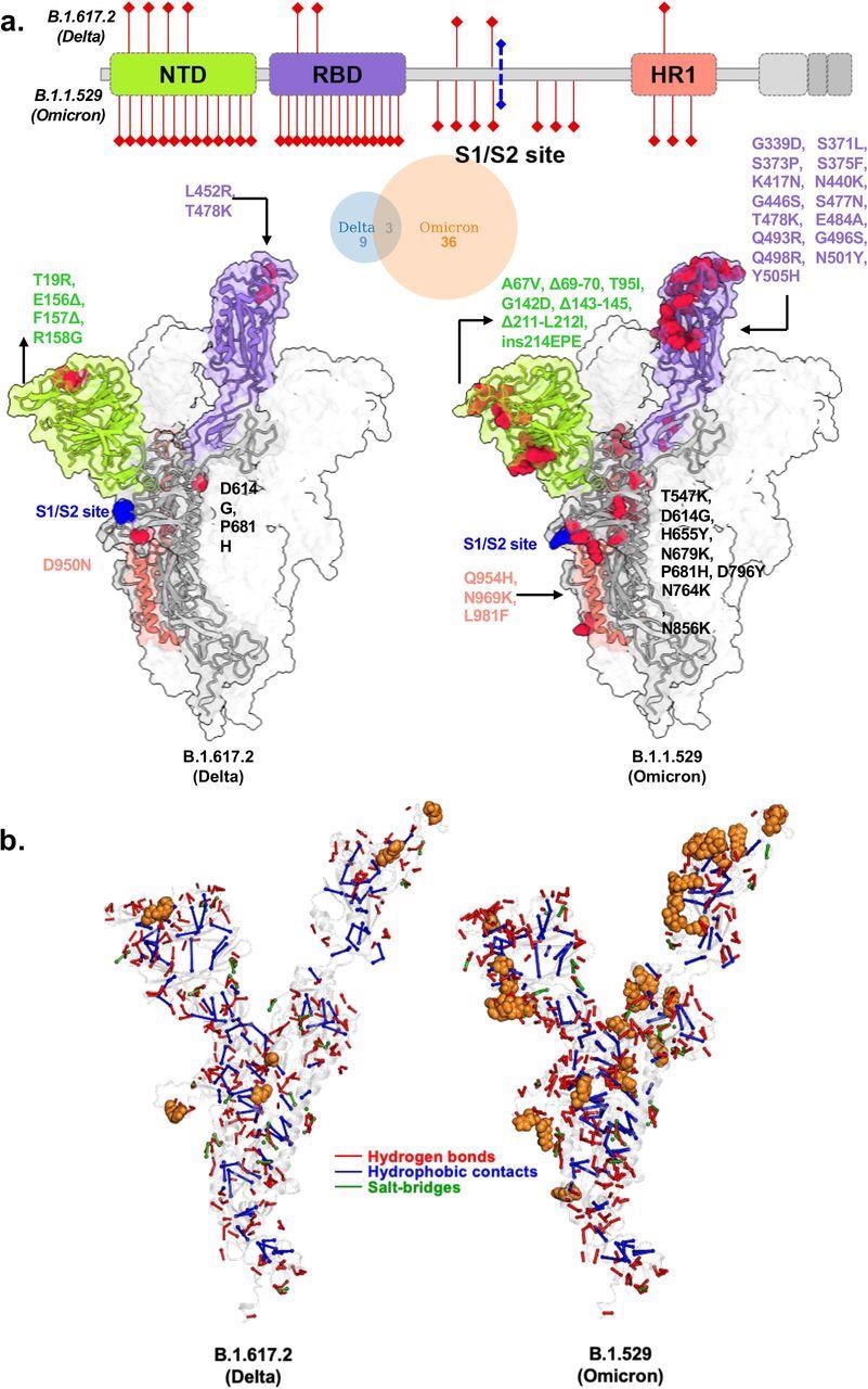 Structural models of SARS-CoV-2 Delta and Omicron spike variants and their corresponding protein intramolecular network. a. Variant structures for Delta and omicron of spike protein displaying mutational sites in red color. The schematic highlights differences in domain-wise mutations across protein length. b. The non-covalent interactions, including hydrogen bonds, hydrophobic contacts, and salt bridges are shown for Delta and omicron variants in red, blue, and green, respectively. The interactions were calculated on 100 ns molecular dynamics simulation and interactions with >50% persistence are shown. For clarity only unique hydrogen bonds specific to each variant spike protein are marked in red for one chain. The mutations present in Delta and Omicron are marked in.