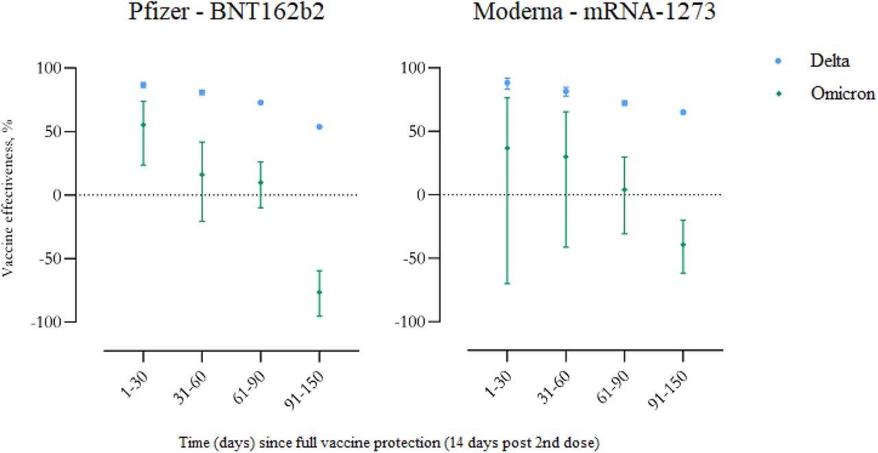 Vaccine effectiveness against SARS-CoV-2 infection with the Delta and Omicron variants, shown separately for the BNT162b2 and mRNA-1273 vaccines. Vertical bars indicate 95% confidence intervals.