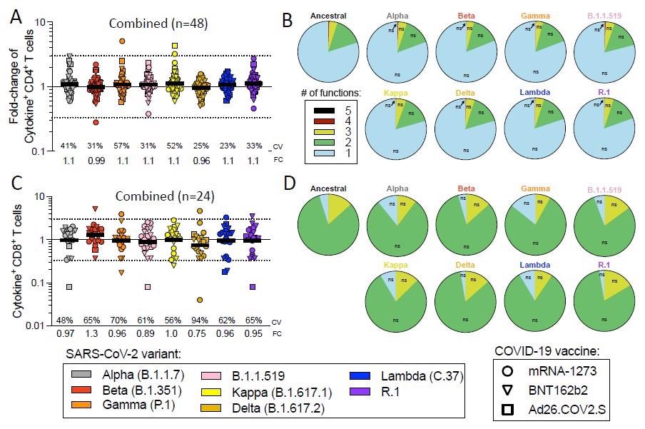 The study analyzed CD4+ and CD8+ T cell responses induced by each tested vaccine to the spike protein of a panel of SARS-CoV-2 variants, including alpha, beta, gamma, delta, B.1.1.519, kappa, lambda, and R.1 variants.